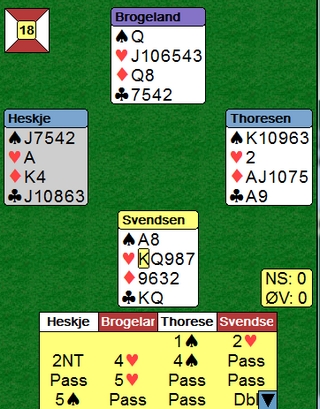Siv Thoresen er ikke mørkredd og finner en fin stamp. 4hj står lett i elleve stikk, men selv om Tonje og Tone fant ruterstjelinga ga det bare +500. 4 IMP mot 650 på det andre bordet. Der passet Kristine Breivik og øst åpnet med 2sp. Nå ble det vanskelig å stampe. Så en liten systemsak jeg har sett flere misse på. Denne ble ikke så dyr siden 2sp heller ikke går hjem, men en annen gang er syd uten med en bløff. Doblingen av 1sp viser spar og da burdet vel Siv tatt ut 2hj til 2sp? When i doubts, bid once more.. er en god regel. Det blir ikke alltid rett, men jeg tror det er vinnende i det lange løp. I alle fall i dette spillet og Torild Heskje kunne se makker notere +650. 5hj koster 500, men for vest kunne dette vært et spill hvor det stor utgang begge veier, til og med på 5-trinnet. Slike spill MÅ vinnes, landslagsdamer!! Det er ikke meningen å henge ut enkeltspillere, men de som er i landslagstroppen må tåle å få kritikk når slemmer som er til å slenge i veggen spilles bort. Kontrakt 6sp og hjerter ut fra øst.