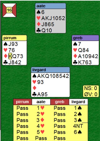 Per Erik Austberg var forhindret, så i hans sted stilte eks.landslagsspiller Odin Svendsen. Det fjerde paret denne gangen var veteranlandslagets Helge og Roald Mæsel. I tillegg spilte Nils Kvangraven - Terje Lie og Allan Livgård - Terje Aa. Det var en svært velspilt kamp over 16 spill synes jeg. Kortene var lagt på forhånd og det var mange slemsspill. Når vi ser alle kortene, er bridge lett. Det ble gjort masse gode avgjørelser av alle par, selv med kun sine 13 eller 26 synlige. Det var jammen ikke lett å vinne IMP!! Den første utgangssvingen kom til Nils og Terje der de dundret på i meldingsforløpet. Nils åpner på en hånd de fleste av oss passer og Terje Lie melder utgang der mange ville maks invitert. Når sparkappen gikk, var det ikke mulig å hindre hjemgang i 3NT. Jan Tore og Odin stoppet i normalkontrakten, men måtte betale ut en tier. Et fint poeng av Terje at han ikke melder NT med to små hjerter. Makker skal ofte være spillefører, så 1sp som overføring til 1NT virka smart. Dette var det mest interessant spillet, synes jeg Poenget er øst sin andre melding. Begge vest viser hjerter med 1ru-meldingen. Terje Lie løfter bare til 2hj, mens Jan Tore Berg hopper til 3ru for å vise singelton og hjerterstøtte. Over 2NT (minst invitt) hopper Terje Lie nok en gang forsiktig til 4hj. "Jeg har tillegg, men ikke nok til et cuebid". Odin Svendsen er naturlig nok ikke til å stoppe på det andre bordet. Jeg regner med at dette spillet vil bli diskutert på webmøtet etter kampen. Å splintre singel ess liker ikke jeg fordi det gir et galt bilde av håndens spillestyrke. Makker forventer honnører andre steder enn der de er i virkeligheten. Terje Lie på det andre bordet var uvanlig forsiktig igjen. Når du ser alle kortene, er det en helt grei slem å være i. Det er muligheter både i spar og kløver for det tolvte stikket, men ingen av fargene satt. Med f.eks ruter ut, står det slem om en velger å ikke røre trumfen. Tre ganger kløver for å kaste en spar og så krysse. Når hjerteråtteren ikke kan gi stikk, vil slemmen kunne vinnes. I praksis tror jeg ikke dette er beste spilleplan. En enkel sparkapp er nok matematisk beste plan, kombinert med knekten tredje i kløver. Venstrehåndsarbeid av Roald og Allan i 6hj var spillet over på et minutt. To ganger hjerter før han stjal to spar på den ene hånda og to ruter på den andre. I posisjonen under til høyre var det bare å slippe den første eller den andre kløveren og 12 stikk var hjemme uansett hvordan fargen satt. Spillet ble (selvsagt) kopiert på det andre bordet. Panterdobling av Jan Tore Berg Panterdobling er et uttrykk for å doble et utgang som står hos motparten når du "vet" at de vil ta ut. 3NT er til å slenge i veggen, men Allan Livgård som hadde meldt 3NT med to små i motpartens farge turde ikke stå med og stoppa i 4ru. Roald Mæsel løfta fint makker 4ru til 5ru på det andre bordet og vant en fin utgangssving. Så var det en storeslem ved begge bord Helge Mæsel sin åpning i 4hj var mildt sagt i overkant. Jeg kjenner de som til og med ville åpnet med 2kl for å hoppe til 4hj neste gang. Han kom imidlertid sterkt tilbake. Legg merke til Roald Mæsel sin 4sp-melding. Når makker åpner med 4hj, skal den fargen være trumf og 4sp setter fokus på det svake punktet i ruter. Nå var ikke Helge til å stoppe. Allan legger også inn en storeslemsinvitt med 6ru og Terje Aa brukte ikke mange sekunder på å melde 7hj, Nye konvensjoner Det dukker stadig opp meldinger jeg ikke har sett brukt på denne måten før. Etter 1hj - 1sp - 2hj kan det være vanskelig hvis 1sp-melderen har gode kort. Mange vil måtte kreve med 3-kortfarger på 3-trinnet. Terje Aa og Allan Livgård har løst dette ved å spille 2sp som et generelt utgangskrav. Makker har alltid seks hjerter når han gjentar den over 1sp, så hvis syd har lang spar og svake kort, må han passe. Det er godt mulig de har andre måter å vise en svak hånd med spar (1hj - 2sp kanskje?) 6sp var uavgjort spill siden det var bare å stjele ruterutspillet, ta ut trumfen og kappe hjerteren. Et IMP er et IMP Selv med åpne kort vil mange slite med å vinne tretten stikk, men Terje Lie hadde ingen problemer uten å sett kontrakten i fare. Hjerter ut til esset (bort med en kløver), ruter ess og ruter til damen fulgt av fire ganger spar. Når trekort ruter hadde fire spar, forsvant to kløver i bordet og en kløverstjeling gir det trettende stikket. Fint håndverk som betaler seg bedre i par enn i lag. Skulle noen stjele spar tidligere, er tolv stikk aldri i fare. ______________________________________________________________________________