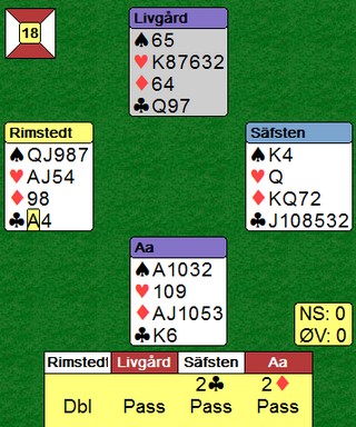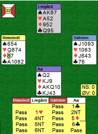 Spill 20: Forsiktig av Terje Aa (og Allan?) Jeg vet ikke hva du ville meldt på syds hånd andre gang, men 2sp ser da ikke dumt ut med renons i makkers hovedfarge, selv om han har 10 honnørpoeng og god fordeling? Denne gangen hadde makker lite bortkastet i hjerter og de andre fargene satt greit. Kanskje Allan kunne strukket seg til 3sp også? Han har tross alt 15 hp og en slags NT-åpning? Sverige banga ut og nok et stor tapsspill for oss. 10 nye IMP til Sverige som leder 24-2.