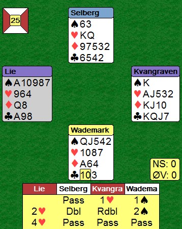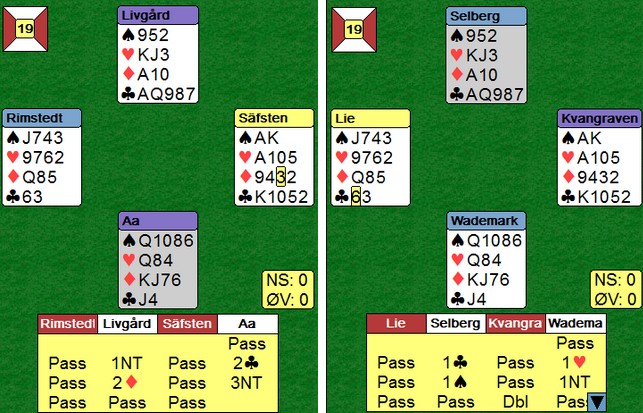 Etter to knepne tap og en liten seier, trengte Norge et godt resultat mot Sverige. Det er ingen lag som har scoret noe særlig, så det er alle muligheter enda. Andre spill - Åpent Rom: "Bid your suits" Jeg ville meldt sparen min i øst i første melderunde. Det er ikke sikkert Terje og Nils hadde klart å stoppe under utgang likevel, men nå ble det i alle fall umulig siden 3sp må være krav. 4hj er slettes ingen håpløs utgang med hjerteren 3-2 og en kløverhonnør i syd og ellers ikke alt for skeivt fordelt. Etter nords opplysende dobling er delkontrakt absolutt å foretrekke. Spill 18 - Lukket Rom "500 out of nowhere" Hadde noen passet mot meg med øst sine kort, hadde jeg beskyldt dem for svindel. En utrolig aktuell pass på makkers negative dobling og 500 mot det som ser ut som maks en delkontrakt. Har svenskene virkelig dagen sin mot oss? Nils og Terje kommer i 4sp og går to beit. 12 IMP til Sverige som leder 12-2 etter to spill. Spill 19: God oppvurdering av Allan Han valgte å oppvurdere denne fine 14-poengeren til 15-17 og kom med det i utgang. Jeg vet ikke om den kan beites med åpne kort, men ruter ut til damen gjorde spillet ikke så vanskelig. Spar i stikk to og da var det 1-2-4-2 = 9 stikk. Jeg vet ikke hva du synes om Nils sin gjenåpning i ugunstig sone. Terje gjorde nok det beste ut av situasjonen ved å passe og etter et ikke helt topp motspill ble det hele ti stikk og + 480 ut for minus 2 IMP. En blå lapp av syd og helvete hadde vært laus. Litt mye parturnering, unge Kvangraven? 17-5 til Sverige Hvis Nils har tenkt å spille en egen kontrakt, er det en logisk brist å doble fordi han vet at makker har minst fire spar og minst tre hjerter, ofte 4-4 i major. Når han selv har 4-4 i minor er det skummelt å melde seg på fordi det er ingen tilpass. Han håpet vel at makker hadde syd sine kort (og vel så det).