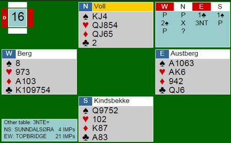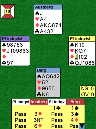 Likevel ga dette en 5'er i pluss. Jan Mikkelsen i det andre rommet avga en flott Lightner-dobling allerede på 6sp. Makker Jon Egil Furunes spilte ut ruter til stjeling, kløver til esset og nok en ruter til stjeling for 300 i beit. Sånne lagkamerater vil jeg også ha!
