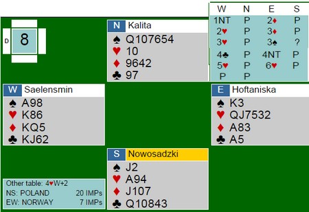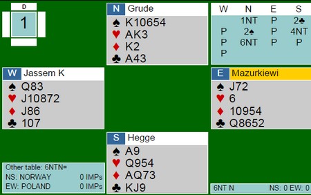 Det er ikke tvil i min sjel om at akilleshælen for å gå videre i det kommende EM, er slemstatistikken. I lagbridge er det i meldingene kampene avgjøres og da først og fremst i de store spillene. I forrige mesterskap var jeg kritisk til de norske prestasjonene på seks- og syvtrinnet og i Nordisk var det også en god del rusk. Hva så med slemmene i Polen? Under finner du de fleste av de store spillene og jeg synes det var mye bra. Ikke alle parene som var med er like samspilte, så det får være med i betraktiningen. Jeg er klar over at bridge i etterpåklokskapens lys er en lett øvelse, men det er også et faktum at over tid er de beste spillerne de beste. Også i slemsonen. 1: 6NT av Hegge - Grude 4NT fra Kristoffer Hegge er ikke Blackwood, men en naturlig invitt. Han har seksten poeng mot makkers 15-17 og tar han med på råd. Selv med sytten og femkort spar er ikke slemmen mer enn omtrent 50%, så et fint meldingsforløp. Gi nord spar åtte, og kontraken er plutselig godt bedre (tåler flere 4-2 sitser). De parene som ikke spiller hopp til 4NT i slike posisjoner som invitt, er tvunget til å gjette. Kanskje skulle syd undersøkt om makker har fire ruter, fordi 6ru kunne godt vært den eneste vinnbare slemmen. 2: FIN MAJORSLEM AV HOFTANISKA - SÆLENDSMINDE 3hj viser bedre kort enn 4hj, og 4kl over 3sp er jeg ikke sikker på. Noen spiller at 3NT i slike posisjoner viser en seriøs sleminvitt i hjerter, mens 4kl bare en cuebid og forteller ingenting om ekstra tillegg, kun kløverkontroll. Ruteren kunne vært skummel for Hoffa, men han kunne nesten ikke legge seg under 6hj nå. En nesten 100% slem som ikke ble meldt ved det andre bordet. 3: DETTE LIKTE JEG OGSÅ Fra Thor Erik sin side i øst kunne det stå masse i dette spillet, men motparten har tatt fra all plass til å undersøke. Da legger han seg forsiktig i det han vet er en spillbar utgang. Det kan se ut som 6ru står på det andre bordet, men Tor Eivind Grunde spilte ut spar til stjeling i bordet. Så hjerter til kongen og kløver mot bordet. Opp på esset og mer spar. Bordet måtte stjele med esset og nå ga ruter 9(!) beita. Fint motspill og litt heldig norsk sving. Legg merke til at Hoftaniska i øst ikke dobler negativt over 1sp for å vise hjerteren, men melder naturlig av sin lengste farge. En god vurdering, synes jeg, fordi 7-4 hender skal veldig ofte ikke spille på 4-4, men med syvkortfargen som trumf. (ikke denne gangen) Han hadde nok håpet å få komme tilbake for å finne evt. hjertertilpass, med den gang ei. 6hj kan vinnes greit med spar ut til stjeling. Hjerter til kongen, spar til stjeling, hjerteress, hjem på ruterkongen og ut med trumfen. Kløveresset er alt motparten får. Med f.eks ruter ut, kan kløveren også godspilles. 4: LITT GJETTVERK Noen gangen er det nesten umuulig å finne ut hva som står. Da kan det være like greit å hoppe ut slik Kristoffer Hegge gjorde. Kanskje mangles EK i kløver, men det kan være at kontrakten står uten den fargen ut. Da er det ikke noe vits i å sladre, fordi 5kl kan jo også være beit hvis 6 ikke står. Trumfen kan være for dårlig, men 7ru kan også være å slenge i veggen. Grei sats fra Snåsa og innertier når kløverkongen ga det tolvte stikkek med esset foran. 5: DETTE ER DET MEST INTERESSANTE SPILLET