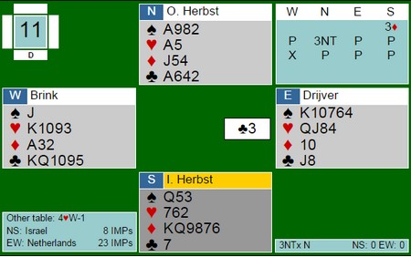 Noen har fortalt meg at det ikke er så farlig å melde inn med dårlige kort når en har lengde i motpartens farge, men Anders Gundersen og Espen Flått viste at det ikke stemmer. Spillefører fikk kun fire trumfstikk. De andre ni tok Norge og noterte 1100 på sin side. Jeg tror faktisk de kunne holdt han ned enda et stikk. _________________________________________________________________