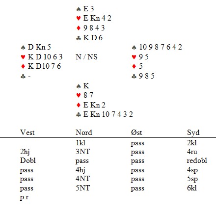 fordi han har kommentert dette spillet som jeg skreiv om for noen dager side. Terje Aa melde 6kl og fikk ruter ut. Nå påstod jeg at 6kl kunne vinnes med hjerter ut, men var beit med ruter i start. Niks, sier Martin Reinertsen. Martin forteller at han spiller slik. Stikker med ruteresset og tar for spar kongen. Så kløver til kongen og på sparesset kastes en hjerter. Nå er det klart for fem ganger trumf til og stillingen før den siste er slik: Den siste kløveren og du ser at vest er ferdig. Han kan ikke kaste hjerter fordi da står bordets EJ. Derfor må han kaste ruterdamen og da forsvinner hjerterknekten i bordet. (Vest kan godt ha en spar i posisjonen over, men da må den kastes nå). Når vest sitter igjen med singel ruterkonge, spilles "bare" en ruter fra hånda og spillefører vinner de to siste. Dette ser kanskje litt skrivebordsaktik ut, men faktisk ikke umulig å klarer for en spiller av Terje Aa sitt kaliber. At vest skal ha KD i begge rødfargene er vel til og med nesten sannsynlig etter meldingsførløpet. _______________________________________________________________________