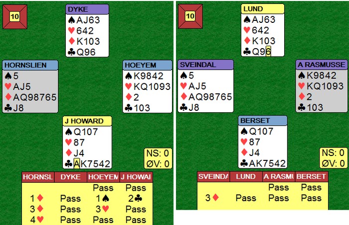 Her har jeg forståelse for Høyem som spør etter hjerterhold hos makker. 3NT står fordi EK i hjerter sitter foran og kløveren 1-1. En heldig utgangssving til Noralia som leder kampen på dette tidspunktet.