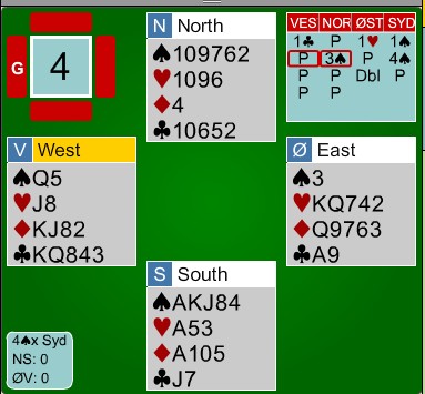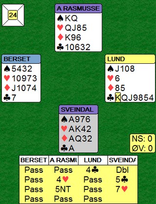 Slufsa hadde en ledelse med 71-28 etter to sesjoner, men i den tredje kom Noralia best i gang. NS: Sveindal - Rasmussen ØV: Høyem - Hornslien Jon Sveindal viser igjen god teknikk etter at ØV ikke var helt nøyaktig i innledningen av spillet. Kløver konge i utspill fra Olav Arve Høyem og mer kløver til esset. Nå gjorde Aksel Hornslien det som de fleste av oss ville gjort, nemlig skifta til hjerter konge. Det ble helt galt. Spillefører stakk og eliminerte kløver og ruter samtidig som han tok ut trumfen. Med tre kort igjen er stillingen som under i det Jon frir seg i hjerter. Glimrende spilt!! Vinnende motspill er å ikke røre hjerteren eller skifte til en liten hjerter. Fort gjort å legge ned kongen vel? På det andre bordet stamper ØV i 5ru og går en beit. +790 - 200 = +590 og 11 IMP til Noralia. Etter 10 spill i tredje sesjon er stillingen 26 - 0 til Noralia og sammenlagt 71 - 56 til Slufsa UAVGJORT SPILL Når vi ser alle kortene er det lett. Jeg er likevel imponert over begge bord. Kløverdame i utspill står, mer kløver til esset, liten ruter til kongen og kløver til stjeling. Øst på bordene er Aksel Hornslien og Justin Howard. I spill 10 har Sveindal - Rasmussen en misforståelse der de var uenige om NT-intervallene etter innmelding og havnet i 3kl med 26hp og balanserte hender. Slufsa meldte 3NT og henta 10 IMP. 34 - 11 til Noralia i tredje sesjon. Stillingen med 14 spill igjen er 82-62 til Slufsa