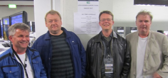 Det er fem spill igjen av semifinalen mellom SLUFSA og NORALIA, men kampen er avgjort. Trønderne leder med 57 IMP og det er ikke krutt nok igjen på de siste spillene til å ta inn så mye. I finalen blir det Norge mot Nederland og den starter kl. 10.00 i morgen. Da skal vi sitte pal og heie alt vi kan. Børre Lund - Ole Berset - Olav Arve Høyem og Aksel Hornslien NORALIA avsluttet med stil i det fjerde siste spillet. Først melder Jon og Arild en glimrende 7hj, men den spiller seg ikke selv. Arild vant med kløveresset og tok for bordets DKn i hjerter. Han oppdaget sitsen, men det gikk bra likevel Etter DKn i trumf tok han for KD i spar, tok ruter konge og spilte seg hjem i ruter. På sparesset falt tieren og da var det bare å stjele rutertassen i bordet. +1510. Kieron Dyke, Justin Howard, Arild Rasmussen og Jon Sveindal fikk bronse i EM!