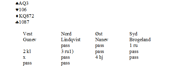 Gunev spilte hjerter ni til knekten, fulgt av kløver til damen. Boye la kløver sju for å vise trekortsfarge; fra ti, åtte, sju, liten ville han lagt åtteren. Den lasjerte Espen med konge, ni blokk!