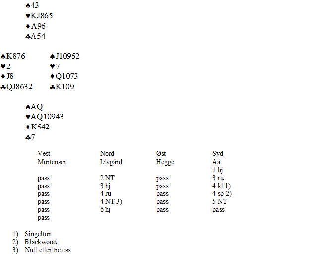 Men i øst satt det en våken motspiller i Kristoffer Hegge. Han la ruter dame da det ble spilt liten ruter fra blindemann! Dermed ble ikke vest innspilt på sin single knekt! Spillefører stakk med kongen og spilte ny ruter. Den kunne Kristoffer stikke, og spille spar for en bet!