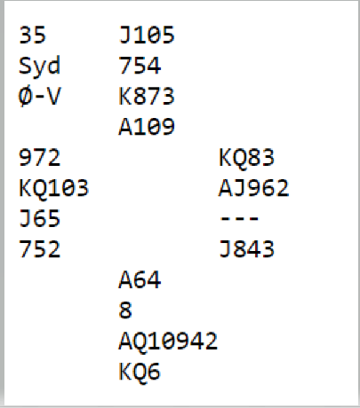 Dette er en kjempe av en svarhånd og alle tenker umiddelbart på slem, Da lønner det seg å ta det rolig med krav- bud 1 spar og høre med om makkers hånd. Over 1 spar hopper Nord til 3 kløver som utgangskrav, 16+ hp, og da er det vel bare å kjøre på. Blackwood avdekker 3 ess i Nord og på 5 NT som benekter ekte konge har Syd valg om å melde 7 spar, 7 kløver eller bøye av med kontrakt på 6- trinnet i sort farge. Optimisme fører til stopp i 7 spar og Nord kan ikke melde mer da.