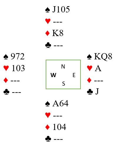 Erichsen var i 5 ruter etter at øst hadde være med og doblet opplysende (etter 1 ruter-3ruter). Vest spilte ut hjerter konge og spilte mer hjerter i andre stikk. Syd stjal og tok ut trumfen. Han trumfet så den siste hjerteren og spilte tre runder kløver. Dette var igjen: