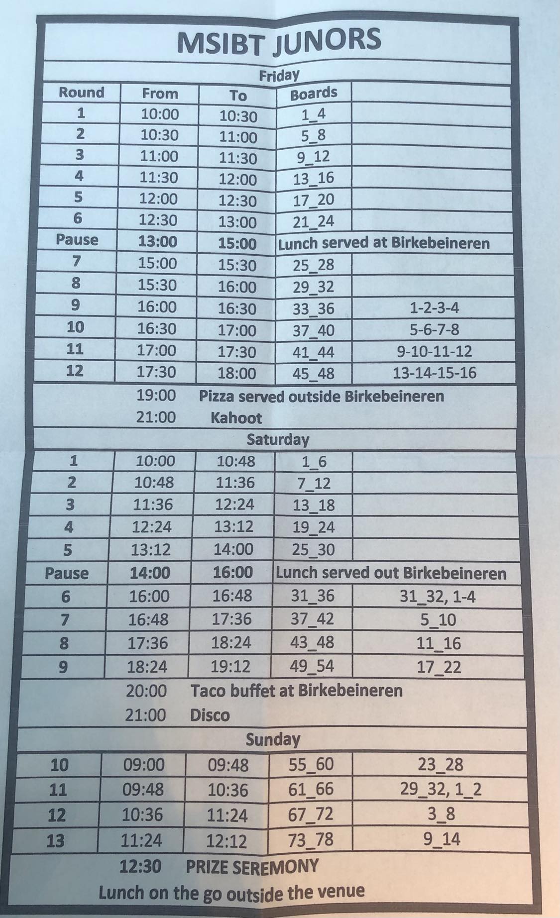 Trondheim ungdomsbridgeklubb og Helgeland juniorbridgeklubb er her på vei til Lillehammer for å delta i den internasjonale bridgeturneringen for juniorer. I reisefølget fra Trondheim er vi 23 ungdommer og 5 voksne. På Lillehammer bor vi i leilighetshytter på Birkebeineren. Marit Sveaas International Bridge tournament spilles på Scandic Lillehammer. Opplagte juniorer er i gang i strålende vær. Følg oss gjennom helgen! Program Junior pairs A-finale Junioir pairs B-finale Juniors rookie