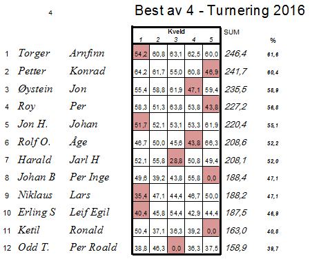 I klubbmesterskapet leder Arnfinn og Reidar 9% foran Trond og Stein mens Edd Robert og Jan Gunnar er ytterligere 7% bak på 3.plassen. Det er en spillekveld igjen.