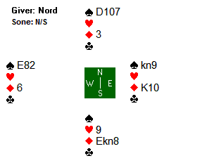 Kløver dame holdt stikk og Pernille fortsatte med to runder trumf. Dessverre viste det seg at trumfen satt 4-2 og at vest måtte få et trumfstikk. På kløver ess fulgte øst beleilig med kongen. Spillefører tok også for kløver knekt før den siste kløveren ble spilt. Nå måtte vest beslutte hva hun skulle gjøre i følgende posisjon: