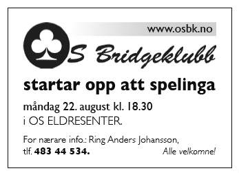 Nå er det kun finalen igjen av årets sommerbridge. Siste kveld spilles mandag 12. september og klubbspiullingen starter opp umiddelbart etterpå. Lundamo BK er først ut med sesongstart torsdag 15. september, mens Melhus starter opp igjen mandag 19. september.