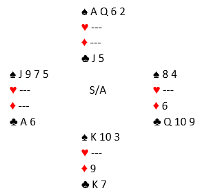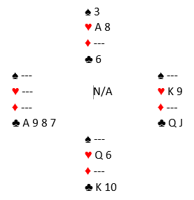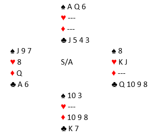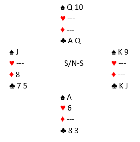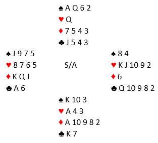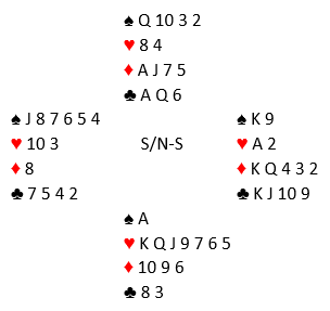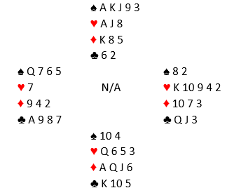Standard kontrakt var 3 grand, de fleste steder med nord som spillefører. Ikke unaturlig valgte øst å spille ut hjerter 10 som gikk til knekten (eller noen steder liten hjerter som gikk til åtteren, hvoretter det samme spillet utvikler seg). Noen la ned spar ess før de gikk over til syd og tok sparfinessen. Det er teknisk feil spilt med en sånn farge da å legge ned esset først kun tar med seg damen singel bak, men man får med de fargebehandlingen ikke med seg damen fjerde foran. En direkte finesse gjør at man kan gjenta finessen og få med seg damen fjerde i saks, mens begge variantene selvsagt løser damen tredje eller dobbel foran. De som fikk tak i fem sparstikk hadde etter hjerterutspillet elleve sikre stikk. La oss si ruterstikkene blir innkassert før sparstikkene, så spar til bunns. Før den siste sparen spilles ser det slik ut: