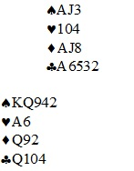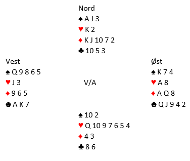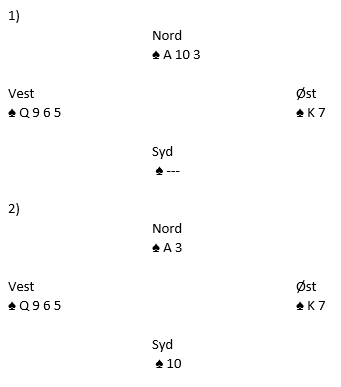 Hvis nord startet med fire spar satt han opprinnelig med AJ103, og nå sitter han i så fall igjen med A-10-3. Vest spilte spar mot bordet og nord fulgte med spar 3. Det er to muligheter: