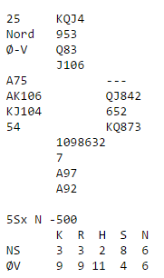 Motparten var flinke og var over Aabye-Saur (Ø/V) sin 4 hjerter med til 4 spar hvor det er kun en bet om ikke Ø/V spiller kløver med det samme, og vest får seg en kløverstjeling. Vinnerparet gikk imidlertid på til 5 hjerter, en kontrakt som er avhengig av å tippe ruterhonnørenes plassering om spillefører bli satt på prøve. Teoretisk burde N/S ha vært med til 5 spar som blir to eller tre doblede bet mot Ø/V sin +650. Men syd hadde to ess og trodde ikke at 5 hjerter stod. Derfor doblet han, og dermed var det raskt +850 til Aabye-Saur - ren topp!