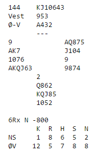 Vest var ved begge bord i 4 spar og fikk hjerter konge i utspill. Om en ser kun på Ø/V sine kort er det en grei kontrakt å spille. Normalt står den enkelt om trumfen sitter 3-2, det blir som regel maks et par trumftapere og en hjertertaper. Hvis spar sitter 4-1 kan det også gå bra å vinne ti stikk om spillefører tipper riktig på hvem som eventuelt har lengden. Men så kommer tilleggsopplysningene.