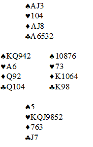 Jon (vest) åpnet med 1 kløver og det kom 1 spar innpå fra nord. Øyvind passet, 2 ruter fra syd, og 3 kløver fra vest. Nord meldte 3 ruter, og Øyvind hadde nesten til 4 ruter, men nøyde seg med 5 kløver. Hvis det hadde gått pass rundt der ville det blitt omtrent middelspill. Men nord meldte ikke unaturlig 5 ruter i de gunstige soneforholdene. Da passet øst, kravpass, han forteller med det at at han ikke tror nok en melding fra makker behøver å være så galt. Hvis øst hadde strukket seg til 5 kløver i forrige runde ville han doblet nå. Aabye var med på notene og meldte 6 kløver! Det kom spar ut og finessen med damen ble tatt med det samme. Siden kløverfargen satt 3-0 ble spillefører avhengig av hjerterfinessen, og som Saur sa til meg: "og selvsagt gikk den, sånn var det denne helgen".