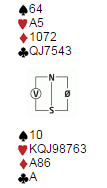 Får man slemambisjoner trengs som oftest også gor meldeteknikk for å ha god kontroll. Kontrollmeldinger, Splinter – og renonsvisende bud samt helst 5- ess Blackwood. I følgende spill fra Fredrikstad BK på tirsdag var bare vinnerparet, Evensen (Ø)- Simensen (V) og Lødding- Heldahl fullt på høyden. Ø og alle.