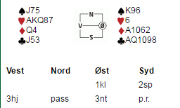 Etter at syd (jeg) hadde hoppet innpå med 2sp, ble Karlis spillefører i 3NT med spar 4 (4. høyeste) i utspill.