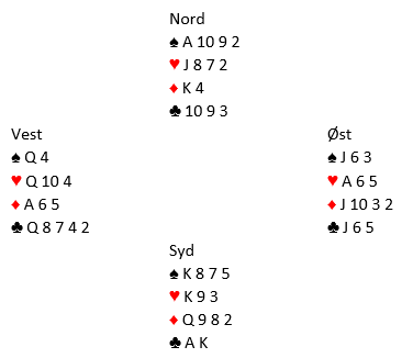Du er her blitt spillefører i 4 hjerter i syd. Vest startet motspillet med spar ess, etterfulgt av en spar til østs konge.