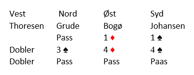 Verken øst eller vest gjør egentlig noe dumt her, men resultatet ble gråstein. Spesielt vil jeg frikjenne vest. Noen vil kanskje si øst bør ta ut vests dobling av 4 spar. Han følte nok at han med 4 ruter hadde sagt fra omtrent om hva slags håndtype han satt med, og vest kunne kanskje sett fra hans synsvinkel hatt litt andre kort (bedre spar) slik at 4 spar går bet. Men å melde en gang til med så spesiell fordeling ville vel blitt de flestes valg? Vest kan neppe kritiseres for å doble 4 spar med to ess (og E-D i den ene fargen) og singetelon i makkerens farge, en makker som hadde åpnet! Men 4 spar doblet var ikke til å rokke, +590 til Vestfold som til tross for det litt komiske resultatet ved det andre bordet vant 10 IMP på spillet.