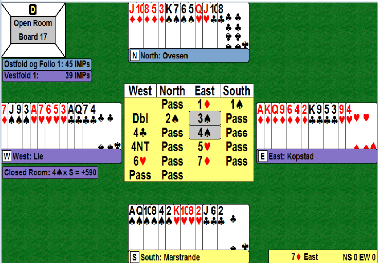 Merk at storeslem i kløver kunne stått på en heldig dag (må ha kløveren 3-2 og ruteren gående). I 7 ruter var det ingen sjanser, og med den fæle trumfsitsen ble det tre bet, N/S +150. Lite ante spillerne ved det bordet at Ø/V sitt lag skulle vinne 10 IMP på dette spillet!