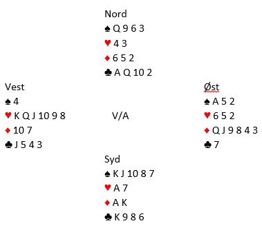 Du avslutter med en markert finesse over vests kløver knekt – elleve stikk. Det som fra start så ut som et kjedelig spill, og hvor vi trodde den som eventuelt kunne ha kløverlengde var øst, forandret seg til det motsatte.