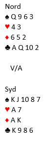 Syd er i 4 spar etter at vest startet meldingene med svake 2 hjerter, og vest spiller ut hjerter konge. Dette er et hverdagsspill, og i lagkamp ville det gått fort i glemmeboken, kontrakten kan jo ikke gå bet. Du må tape til spar ess og de vil også få ett stikk i hjerter. Det ser ut som resten står, men det kan jo av og til bli en kløvertaper. I parturnering er det viktig å sikre seg de elleve stikkene selv om kløver knekt sitter fjerde. Med en så fet kløverfarge er det alltid fire stikk om den sitter 3-2 eller knekten singel, og du kan om du gjetter på hvem som har fire kløver legge ned topphonnørene i riktig rekkefølge og og oppdage hvem som har fire, og så eventuelt ta en markert finesse over han som hadde knekten fjerde fra start. Hvis du tror vest har fire spilles etter uttrumfing kløver ess fulgt av liten til kongen, og 4-1 sitsen med fire hos vest oppdages kanskje. Hvis du derimot tror øst er den som eventuelt har fire spilles esset fulgt av damen, og fire hos øst kan oppdages, hvoretter en markert finesse tas over han.
