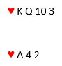 Her har motparten seks kort i hjerter. Hvis du ikke hadde hatt tieren hos nord ville kun fargen fordelt 3-3 vært muligheten for å oppnå fire stikk. Siden tieren er på plass er det mye større sjanse for fire stikk, men det kan også føre til et valg. Vanlig teknikk med en slik farge er å starte med en honnør fra nord, så spille liten til syds honnør. Hvis knekten hadde vært dobbel ville den kommet på andre gang, og nords to siste kort i fargen ville vært sikre stikk. Og hvis øst hadde hatt singel hjerter ville du oppdaget det, og du hadde hatt en markert finesse over vest. Men ofte vil begge følge med små kort to ganger, og du vet det er igjen to kort i fargen, knekten og en liten en. Du spiller så i fargens tredje runde liten mot Q-10, og la oss si vest følger med den gjenværende lille hjerteren. Da har du valget, finesse med tieren (riktig hvis vest hadde hatt knekten fjerde fra start), eller toppe og håpe knekten faller hos øst (riktig hvis fargen satt 3-3 fra start med knekten hos øst). Et sånt valg kan være rett og slett det – et valg – og det er ganske marginalt hva det skal satses på. Men ofte har du gjennom spillet fått en viss peiling på om vest eller øst har flest ledige plasser. Med slik informasjon kan enten finessen være opplagt største sjanse (hvis vest har flest ledige plasser), eller å toppe klart beste sjanse (hvis øst har flest ledige plasser). Men noen ganger har du gjennom spillets gang fått så god peiling på sitsen at du er sikker på hva du skal gjøre, du har full telling! Det avhenger av at du har fulgt med og talt opp fordelingen i de andre fargene.
