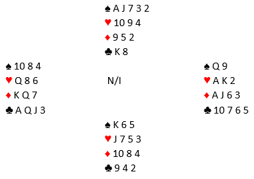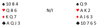 Dette er fra World Games i Polen forleden. Tor Helness (øst) var i 3 grand og fikk en hjertertass ut fra syd, og han vant på hånda. Det var bare åtte toppstikk, så kløverfinessen måtte forsøkes. Da liten til damen stod var kontrakten sikker. Og nå er det vel også overstikk? Nei, Helness har vært ute en vinterdag før og repeterte ikke kløverfinessen, men tok sine ni stikk...trodde han.