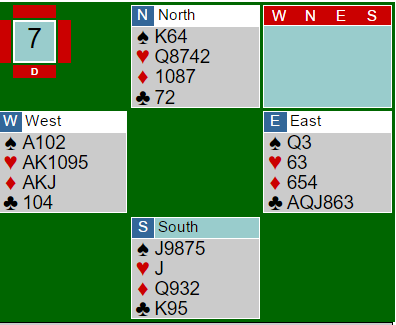 Hvis syd hadde stukket kløver 10 med kongen ville spillefører enkelt vunnet slemmen (som ville gått bet om det hadde kommet sparutspill). Etter hjerter ut, kløver 10 til syds konge tas et eventuelt sparskift med esset, så uttruming. Deretter hjerter konge og ett ekstra stikk i den fargen etableres ved å presse ut nords dame mot trumf. Det godspilte hjerterstikket gir avkast for spartaperen, og siden ruterfinessen går blir det tolv stikk. Men idet syd lasjerte i tempo i første trumfunde var det verre for øst. Han kunne fortsatt vunnet ved å spille kløver til esset, men da gjør han seg avhengig av ruterfinessen som er unødvendig om kløver konge sitter i saks. Så han tar nok en kløverfinesse til. Da vinner syd med kongen og spiller spar, og spillefører er sjanseløs. Han kommer seg ikke hjem for å ta ut syds siste trumf – en bet.