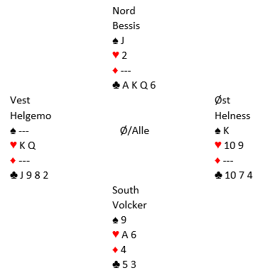 Hvis Volcker hadde sett for seg trumfforfremmelsen og kjent igjen mønsteret for en klassisk tosidig skvis kunne han spilt hjem kontrakten. Da må han ikke ta hjerterstjelingen hos nord. Kanskje kan den vinnenede spilleplanen føre til en ekstra bet om ruteren ikke sitter 2-2, men likevel...