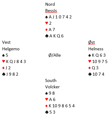 Helgemo spilte ut sin single spar til esset. Det ser så naturlig ut å trumfe en hjerter hos nord, og det ble hva Volcker gjorde. Men da gikk det galt. Etter hjerterstjelingen tok han for trumfesset, men så var han låst i bordet. Han tok tre runder kløver fra topp og kastet sin siste spar. Kløveren satt heldig, men hvordan skulle han komme seg over til syd for å få tatt ut trumfen? Hvis han spiller spar får vest høyning for ruterknekten. Han forsøkte kløver. Men med singel trumf dame igjen så ikke Helness noen annen nytte i det kortet enn å klaske det på idet nords fjerde kløver ble spilt. Dermed ble Helgemos trumfknekt forfremmet til betestikket, Zimmermann +200. Det var sammen med +650 verd 13 IMP. Det kunne imidlertid blitt +2330 til N/S i stedet, og i så fall 17 IMP den andre veien, en sving på hele 30 IMP. Ser du hvordan det kunne ha skjedd?