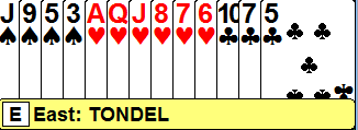 Da syd meldte 4 ruter ble det vanskelig for nord. Sluttkontrakten 5NT var forfor høyt, og Ø/V fikk tak i bet etter det gode utspillet spar 9 (!) fra Tøndel.