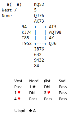 Noen vil som øst sikkert melde 4 hjerter direkte over 1 hjerter. Men vest kan være fullstendig blank, og er han det har utgang dårlige utsikter. Dobler etterfulgt av en løft til 2 hjerter ville vist rundt 16-17, kanskje 18 poeng (med vanlig åpning passes på 1 hjerter om ikke nestemann melder). 3 hjerter bør følgelig bety ca. 19-20 poeng. Vest må her huske at han ikke har lovet noe som helst, og med en dobbelton og fin trumf bør han legge på til 4 hjerter.