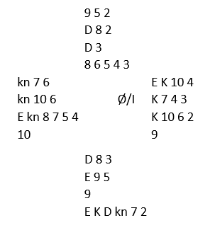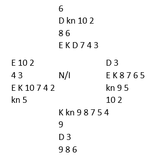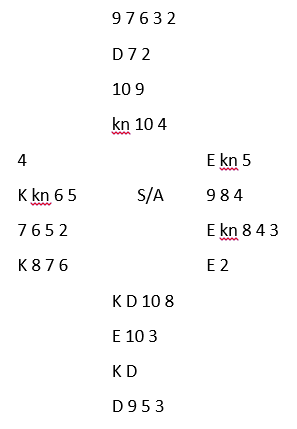 Espen fortsatte i ruter som syd stakk med kongen, vest fulgte med femmeren. Syd trakk spar konge fra hånden som øst stakk med esset. Nå tok Espen for kløver ess, fikk styrke fra makker, spilte kløver til vests konge, fikk en kløverstjeling og skiftet til hjerter.