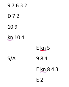 En vanskelig avgjørelse – det kan være rett å passe, doble, melde 4 ruter eller 3 grand. Jeg valgte det siste, og det gikk pass-pass og dobler fra sperremelderen. Hva nå? Jeg valgte å stå med, men det ble to raske beter med denne sitsen:.