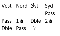 Nå ble jeg plutselig litt varm i hodet og ikke så full av selvtillit lenger. For en stakket stund kunne det se ut som jeg risikerte å bli spillefører i 2 spar doblet – neppe noen fest for andre enn motparten. Jeg husker jeg tenkte: «Hvis øst passer nå blir dette et av de mest pinlige øyeblikkene i min bridgekarriere, og det kan i så fall neppe toppes senere». Sekundene tikket og mitt hode ble varmere og varmere. Men så kom øst og reddet meg, og det med en dramatisk skivebom.