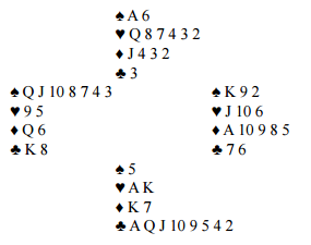 Fra bulletinen sakser jeg et spill av en av mine favorittskribenter, Eddie Kantar. Han leverer alltid instruktive spill med klare poeng og gode tips som kan være nyttige også i lignende spill. Dette spillet du nå kan prøve deg på handler om å spille på beste sjanse. Undertegnede er ikke tllhenger av å gjøre bridgen til en matematisk øvelse. Det er selvsagt greit å vite om odds og prosentersjanser, men det er så ofte faktorer som spiller inn og gjør matematikken unøyaktig. Mer viktig enn å regne ut på tiendelen den matematiske prosentsjansen for de forskjellige sjansene er å benytte seg av all tilgjengelig informasjon i meldinger, utspill og det videre spill. Dessuten kan det ofte være et eller annet som gjør at du tror på noe bestemt som kanskje ikke er den største matematisk beste sjansen. Jeg har sansen for spillere som tør spille på det de tror på, vel og merke hvis det oftere blir riktig enn galt.