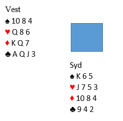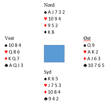 Øst har vist 12-14 grand og er i 3 grand. Syd spiller ut en liten hjerter, og det går liten fra vest, nieren fra nord og esset fra spillefører. Den første tanken syd gjør seg er kanskje at utspillet var blink, makker kan ha K-10-9 i hjerter. I andre stikk tar spillefører kløverfinessen, og nord kommmer inn på kongen. Derfra kommer spar 2 til østs dame og kongen. Hva nå? Spar tilbake ser nærliggende ut, men hva om spillet ser slik ut: