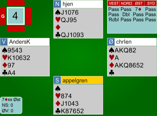 Utrolig nok var der nord som hadde til å doble... Syd spilte ut kløver, og for å gå bare 1 beit, måtte jeg nå ha stjålet utspillet, og etter å ha sett ruteren 4-0, tatt for hjerter ess, før jeg spilte syd inn igjen i trumf. Han måtte da ha spilt hjerter/kløver slik at jeg fikk kastet to spar i bordet. Nord kastet uansett fra seg en spar på ruteren, så da ble det med en beit.