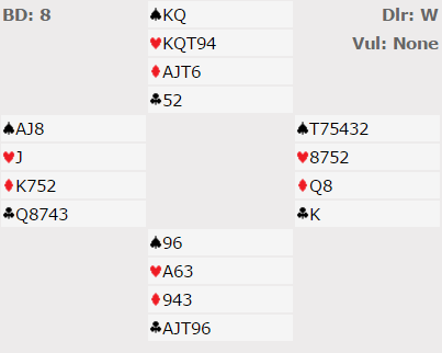 Etter at vest hadde åpnet med 1 kløver endte jeg som nord i 4 hjerter. Kløver konge kom i utspill til esset. Det så ut som fare for at hvis de kom inn før trumfen var tatt ut så ville det komme kløver og mer kløver fra vest slik at trumfhøyning truet. Men det hjelper ikke å ta ut trumfen, for da er blindemann en ørken, ingen inntak til kløveren, og det vil bli to rutertapere og en taper i hver av de sorte fargene. Så inntakene til nord må brukes til å spille ruter, og hvis den trumfhøyningssituasjonen jeg nevnte oppstår må hjerter knekt sitte høs vest. Så kløver ess vant første stikk fulgt av ruter til tieren og østs dame. Det kom spar til esset og mer spar. Her gjorde faktisk vest en feil, han skulle tatt for kløver dame først (kløveren kan ikke utnyttes uansett siden øst har fire trumf). Hvorfor han burde tatt for kløver dame vil du få se om litt. Inne i andre sparrunde ble hjerter konge spilt, så hjerter til esset. Dette var igjen: