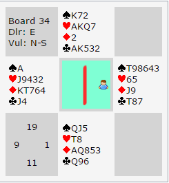 Tidlig i kampen forsvant 11 IMP ut vinduet pga. en misforståelse, en avtale var blitt endret ganske nylig, men den var gått i glemmeboken. Vi kunne tåle en smell til. Så kom dette spillet du kan prøve deg på selv.