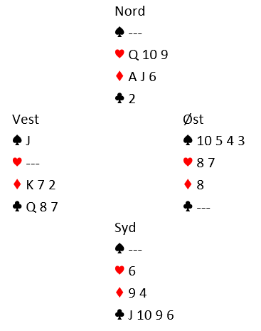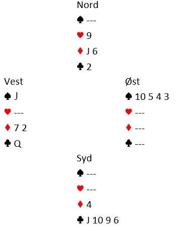 Nå er vinnervarianten basert i å spille ruter 9 med et påfølgende sluttspill. Det ser ut som om vest kan dekke og senere få stikk for ryter 7, men siden østs åtter faller i det stikket kan kontrakten vinnes. Det går altså i så fall ruter 9, konge, ess og ruter 8 faller fra øst. Da tas resten av trumfen. Før den siste trumfen ser det slik ut:
