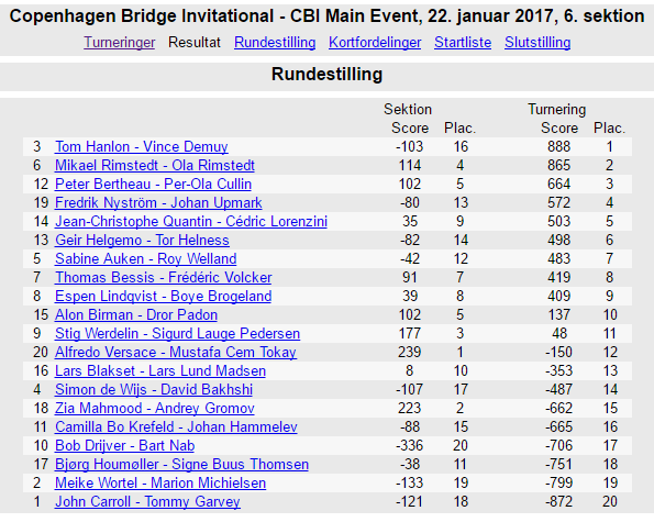 Det ble irske Tom Hanlon og kanadiske Vince Demuy (nå bosatt i USA) som gikk til topps i Copenhagen Bridge Invitational i helgen. De vant foran to svenske par: på 2.plass de unge brødrene Mikael og Ola Rimstedt og på 3.plass Peter Bertheau og Per-Ola Cullin. Helness-Helgemo lå på 4.plass før siste sesjon, men med litt under middels i den ble det 6.plass til slutt. Boye Brogeland og Espen Lindqvist endte som nr. 9.