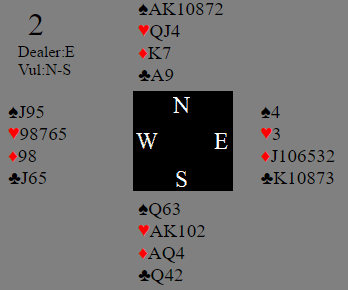 Det er ikke så lett å finne frem til storeslem med disse kortene selv om syd åpner med en sterk 1NT, spesielt fordi øst mange steder kom seg med i meldingene i de for Ø/V gunstige soneforholdene. De som tidde stille med østs kort angret nok på det da N/S fikk tid og anledning til å kommunisere, og noen (ca. 25%) meldte da storeslem i spar eller grand som begge var nedlegg. Der øst var med og forstyrret ble det vanskelig. Men selv om for eksempel nord får spurt med Key-Card Blackwood kan han ikke se tretten stikk sånn uten videre. Det er syds fjerde hjerter (at han har fire kort der han har A-K, og nord Q-J) som gjør det så perfekt, tretten enkle stikk. Hvis syd har en annen 4-3-3-3 fordeling er det ikke nødvendigvis mer enn tolv.