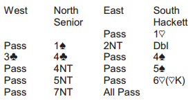 Du vil ikke finne mange moderne meldeteoretikere som vil argumentere for firekorts majoråpninger når det gjeder slemmeldinger. Femkorts major og 2-over-1 systemet er bygd opp for å få god styring på slike ting, og sterk-kløver systemer (evt. med releer) er også ansett som bedre enn de gammeldagse metodene. Men her var Hacketts 1 hjerteråpning på firekorts farge perfekt. Da han doblet østs 2NT viste han god åpning, typisk 15-17 grand (paret spiller med svak grand). Senior krevde med 4 kløver, fikk spartilpasning fra syd, og gikk på med Key-Card Blackwood. Da fikk han vite om to Key-Cards samt trumf dame, og over 5NT (storeslemsinvitt) fortalte Hackett om hjerter konge. Da kunne Senior telle tretten toppstikk!